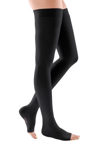 Компрессионные чулки 2-ого класса компрессии mediven plus с открытым носком на широкое бедро и силиконовой резинкой как универсальное решение в лечении заболеваний вен.